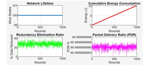 Figure 5(a) shows the number of active sensor nodes over the simulation rounds. It can be observed that all nodes remain alive throughout the entire duration of 1000 rounds. This behaviour indicates that the proposed algorithm effectively reduces energy depletion by limiting unnecessary data transmissions. The stable network operation confirms that the energy-saving mechanisms used in RERESDA are suitable for long-term monitoring applications. The cumulative energy consumption is illustrated in Figure 5(b). The energy usage increases gradually with the number of rounds, indicating controlled energy dissipation across the network. Since only differential and non-redundant data are transmitted, the overall communication cost is significantly reduced. Compared to protocols that transmit raw sensor data, the proposed approach results in lower energy consumption over time. Figure 5(c) presents the redundancy elimination ratio achieved during the simulation. The results show that a considerable amount of redundant data is removed before transmission to the base station. Although small variations occur due to changes in sensor readings, the elimination ratio remains consistently high. This confirms the effectiveness of the cluster-level pattern generation and redundancy elimination process. The packets delivery ratio (PDR) is shown in Figure 5(d). The PDR remains very close to 100% throughout the simulation, indicating reliable data delivery. This demonstrates that reducing data volume through aggregation does not affect communication reliability. The high PDR confirms that the proposed algorithm maintains data integrity while improving energy efficiency