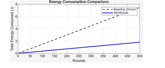 Figure 6 shows how much energy the baseline direct transmission protocol and the proposed RERESDA algorithm use over several simulation rounds. The baseline shows a quick, almost straight-line rise in energy because raw data is sent repeatedly. RERESDA, on the other hand, uses much less energy because it only sends differential, non-redundant data. After 500 rounds, RERESDA is clearly better than the baseline. This shows how well removing redundancy and aggregating different types of data works.