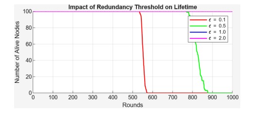 Figure 7 illustrates the effect of the redundancy threshold (ϵ) on network longevity. When the thresholds are lower (ϵ=0.1), nodes run out of power faster, and all nodes die after about 560 rounds. As the threshold goes up (ϵ=0.5,1.0,2.0), the network’s lifetime gets longer because fewer redundant transmissions use less energy. This shows that changing the redundancy level is an effective way to find a compromise between data accuracy and energy efficiency.