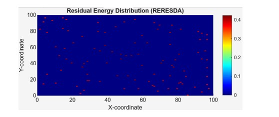 Figure 8 shows how the RERESDA algorithm changes how sensor nodes share the leftover energy. The blue areas show that most of the nodes still have a lot of their original energy. The red spots show that some nodes have less energy left over because they send out different broadcasts at different times. This proves that RERESDA does a good job of spreading out energy use across the network, which makes it last longer.