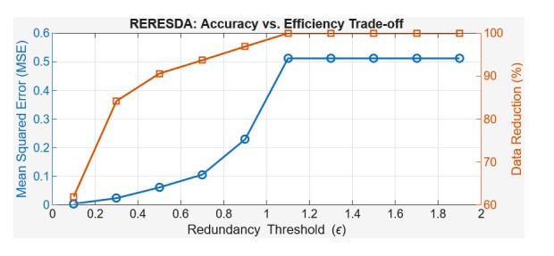 Figure 9 shows how the RERESDA algorithm must choose between accuracy and speed. The blue line shows that the Mean Squared Error (MSE) is very low when the redundancy threshold is low, but it goes up quickly after ε ≈ 1 and then levels off. The orange line shows that Data Reduction (%) gets better as the threshold increases, and it gets close to 100% at higher ε values. This shows that RERESDA does a good work of balancing cutting down on unnecessary transmissions while keeping data accuracy at an acceptable level. This lets the network run smoothly without losing a lot of data quality.