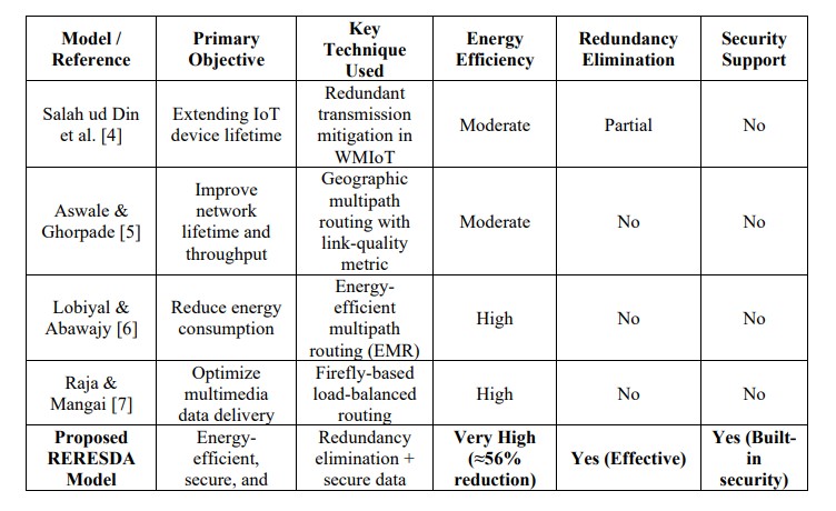 This study has shown that RERESDA is robust, energy-friendly, eliminates unnecessary data, and keeps data safe for wireless sensors. The model tackles not just data repetition, but also safe data compacting and power saving, which cut down on unnecessary data transfer by quite a lot. The index of performance shows, that RERESDA cuts down on power fuel by 56%, keeps stable data delivery rates, and fast, reliable packet transfer when work takes place in changing network ways. The found evidence bought to saw, that combining data repetition awareness with the security layer, usefully extends the life of the route, and there helps make sure data reaches its destination safely. Using RERESDA for data rich but power weak sensor network grouping and motion sensor workstreams proves particularly fitting.