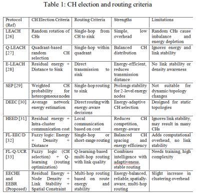 Based on the analysis presented in Table 1, the proposed Efficient Energy-Based Cluster Head Election (EECHE) protocol selects Cluster Heads (CHs) using residual energy and inter-cluster distance to achieve balanced cluster formation. In parallel, the Efficient Energy-Based Routing (EEBR) protocol employs a multi-hop strategy guided by route energy evaluation to ensure reliable and energy-efficient data transmission. By integrating optimized clustering with energyaware and stable routing, the proposed framework enhances network stability, robustness, and lifetime while ensuring fair resource distribution.
