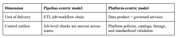 Regulated enterprises increasingly face a dual pressure: accelerated adoption of AI for decision automation and heightened scrutiny over the provenance, privacy, and reproducibility of data transformations. Pipeline-oriented delivery, built as sequences of ETL jobs and point solutions, often scales in volume but not in accountability: lineage becomes fragmented, quality gates become inconsistent across teams, and operational ownership blurs when multiple pipelines replicate similar transformations. Platform-centric data management proposes a different operating logic: shared data services, standardized interfaces, and productized data assets that remain traceable across analytical and AI workloads.