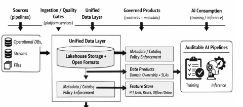 Figure 1 can be read as a layered architectural transition model. The bottom layer provides data persistence and unified storage, anchoring heterogeneous analytical and ML workloads in a shared data foundation. The next layer concentrates metadata, lineage, and policy services that standardize visibility and control across domains. Above it, productized data contracts organize reusable datasets as governed units with explicit ownership, quality expectations, and access rules. The upper ML-oriented layer contains feature generation and feature-serving mechanisms that preserve time-consistent joins and training-serving alignment. The top governance layer connects these technical services to auditability, reproducibility, and oversight requirements. In this reading, the figure does not merely illustrate technology components; it shows how control surfaces migrate from fragmented pipelines into persistent platform services.