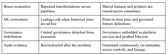 Taken together, the discussion suggests a design principle for regulated enterprises: platformcentric data architecture gains operational legitimacy when governance practices are expressed as platform services (catalogs, lineage, policy engines, standardized validation) and when MLspecific data primitives (point-in-time correctness, offline/online feature separation, shared feature lifecycle) are treated as first-class data layer functions. This orientation places auditability and explain ability prerequisites at the data layer, where provenance, consistency, and access decisions originate. In regulated enterprise AI, that relocation strengthens both operational trust and oversight readiness.