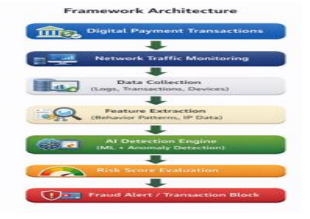 The AI-Enhanced Fraud Detection Framework is meant to detect and prevent fraudulent payment activities in the financial system through the use of smart AI tools and network traffic monitoring [11]. The system is designed to operate at various levels in order to detect suspicious payment activities. These levels include data collection, feature extraction, machine learning, and response. Unlike the traditional system, this system is based on intelligent analysis rather than rules-based systems. The system also has the capability to process a large number of transactions simultaneously through its modularity, where each module works in collaboration to detect payment fraud.