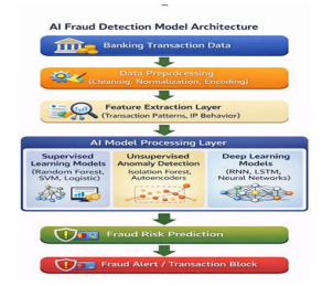 From explaining the limitations of current systems to outlining a modular four-layer architecture—data collection, feature extraction, AI recognition engine, and response actions— the study advances. This system integrates several security tasks, including deep learning (RNNs, CNNs), unsupervised anomaly detection (Isolation Forest), and supervised learning (Random Forest, SVM). The paper offers a thorough overview of how different AI systems work together to handle massive amounts of digital transactions by combining these elements.