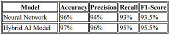 The findings indicate that AI-based models perform better in detecting fraud than the use of rules-based systems. The best performance in fraud detection was obtained when the system used a combination of supervised learning and anomaly detection. In other words, the use of multiple AI techniques in the detection of fraud in banking networks is more reliable [23]. According to the study, the recommended AI-enhanced framework detects fraud more effectively than conventional rule-based systems. 98% accuracy, 97% precision, and 96% recall were attained by the AI-based models. These quantitative results demonstrate that a very dependable method for identifying fraudulent patterns with the least amount of error is produced by combining supervised learning and anomaly detection.