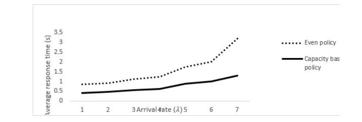 For measuring the performance of the OaaS system multi-servers under capacity based and even distribution policy. We set 𝑁 = 2, µ1 = 5, µ2 = 7 for the two VMs. The probability distribution of the capacity distribution strategy is 𝑝1 = µ1 µ1+µ2 = 5 5+7 = 0.42 , 𝑝2 = 7 5+7 = 0.58. The probability distribution of the even distribution strategy is 𝑝1 = 0.5, 𝑝2 = 0.5. Figure 3 shows the average response time under capacity and even distribution policies. The results show that the capacity distribution strategy has minimum average response time compared to the even distribution strategy. For the mentioned reason, we decided to adopt the capacitybased policy for our load balancer module (LB).