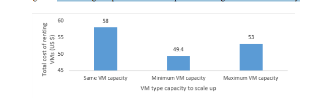 From both figures 6 and 7, we can see that the Minimum_VM_capacity strategy, which is used by the proposed scaling up algorithm, provides the minimum average total cost for renting VMs at the end of the simulation period. In addition, it maximizes the utilization rate of the VMs. This makes the algorithm cost-effective while it meets the QoS requirements compared to both the Same_VM_capacity and maximum_VM_capacity strategies.