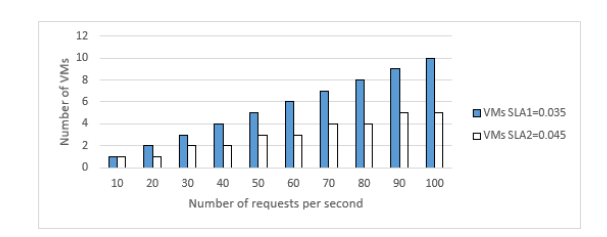 From Figure 8, we can see that overall, the number of required VMs increases as the number of requests increases to meet SLA requirements. Furthermore, it is obvious that the OaaS system allocates more VMs to meet SLA1 compared to SLA2. Because SLA1 has smaller mRT (Maximum average response time) and as the number of incoming requests increases, the OaaS system scales up the number of VMS to ensure meeting the SLA1 requirements.