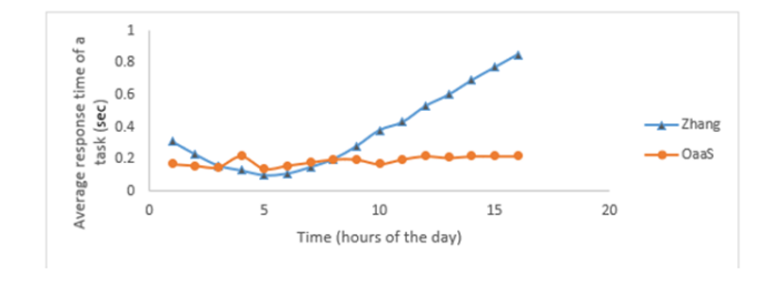 The results in figure 9 also show that the OaaS by maintained a good VMs utilization and scaling up the number VMs when needed it manages to keep a lower response time, 0.2 seconds at high load (6 PM), when the Zhang algorithm has a larger response time for the same period and the same load. (0.9 seconds). Clearly, Zhang algorithm performs badly after the period of 7 AM where the load is increased and the fixed number of VMs becomes highly saturated which is reflected in figure 4 by an exponential shape for the response time. This issue might constitute violating the QoS requirements. On the contrary, in the proposed approach, the shape of the response time curve is almost constant while varying the load in accordance with the requests SLA. This confirms the scalability of our performance based OaaS system.