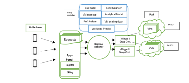 In this section, we present a queueing theory model for the OaaS system described in section 2. Recall that, the OaaS system contains independent parallel load balancers. Each load balancer is associated with a pool of VMs that can be located on different physical servers and within different cloud data centers. As the user requests arrive at the OaaS system, they are classified in the Regional Classifier (RC) based on the app’s requirements and forwarded to the proper VM_type Group Controller’s Load Balancer (LB). The LB assigns the arriving requests to the corresponding pool of VMs. Each VM may process multiple requests simultaneously. Unlike other works on offloading, we allow the VM processor to be shared by multiple requests at the same time. Processor sharing improves the VM utilization and reduces the number of leased VMs and hence reduces the offloading cost for both the client and the service provider.