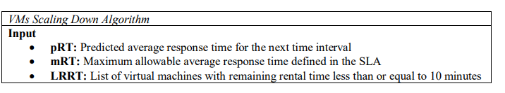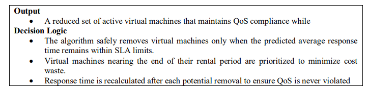 The VM scaling-down algorithm aims to reduce over-provisioning while preserving QoS. VMs are prioritized for removal based on the shortest remaining rental time to minimize cost waste. A VM is removed only if the recalculated pRT remains within the SLA threshold. Pending requests are allowed to complete before VM termination, ensuring service continuity.