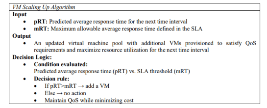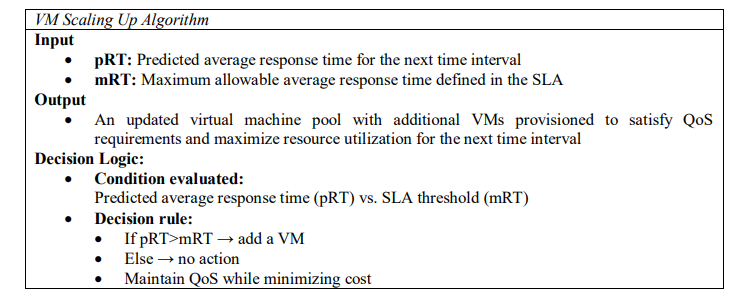 The VM scaling-up algorithm incrementally provisions additional VMs until the predicted response time satisfies the SLA constraint. At each iteration, a VM is selected from available cloud data centers based on the minimum cost-to-capacity ratio to ensure cost efficiency. The response time is recalculated after each addition using Equation (10). This process continues until pRT ≤ mRT, ensuring SLA compliance with minimal resource cost.