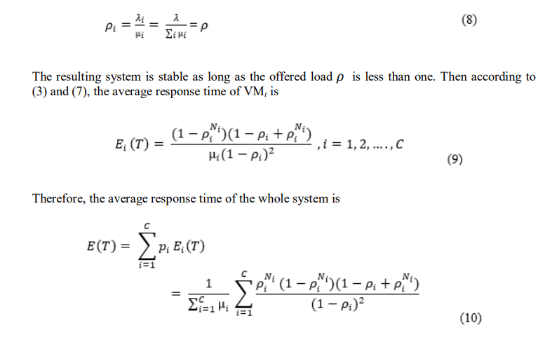 In this section, we use the results presented in the previous section to derive the average response time under different assignment strategies. Assume that the number of VMs in the system is C, and the service rate of VMiis µ𝑖 . The maximum number of concurrent users of VMiis 𝑁𝑖 . Let 𝜆 denote the total Poisson arrival rate. A user is dispatched to one of the C VMs independently in random using a probability distribution 𝑝𝑖 , i=1,…..,C. So, each VM is an M/M/1/N/PS model as mentioned in the previous section.