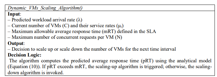 The analytical model component periodically retrieves predicted workloads for the next interval, along with the current VM pool configuration, and computes pRT. A fixed time slot of 10 minutes is adopted to accommodate VM boot and pre-provisioning delays. If pRT exceeds mRT, the scaling-up algorithm is invoked; otherwise, the scaling-down algorithm is applied.
