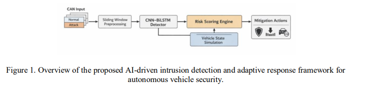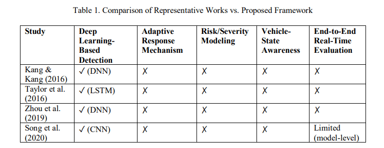 Therefore, there remains a clear need for an integrated approach that combines (i) deep learningbased detection, (ii) risk-aware severity scoring that incorporates vehicle context and subsystem criticality, (iii) DRL-based mitigation decision-making, and (iv) real-time latency evaluation to support safety-critical autonomous vehicle deployment.