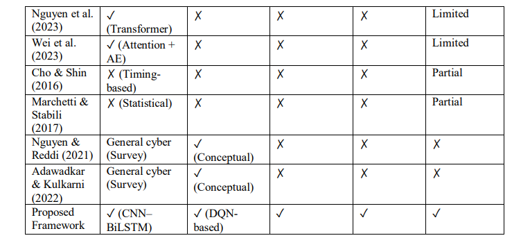 In contrast, the proposed framework integrates temporal deep learning detection, contextual cyber-physical risk modelling, and reinforcement learning-based mitigation within a unified architecture. This enables not only accurate intrusion detection but also adaptive response optimization and system-level damage reduction while maintaining real-time feasibility.