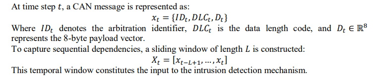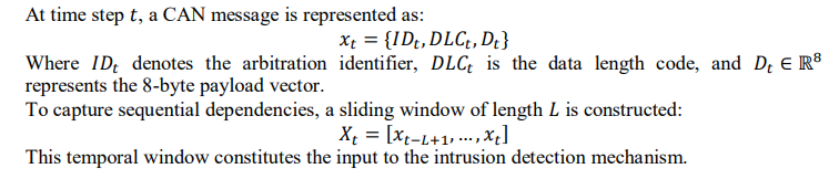 Each CAN record contains a timestamp, arbitration identifier (ID), data length code (DLC), and an 8-byte payload. To enable temporal modelling, raw hexadecimal payloads were converted into numerical representations and organized into fixed-length sliding windows of size L=50. The window size was selected to capture short-term temporal dependencies while maintaining computational efficiency suitable for real-time deployment.