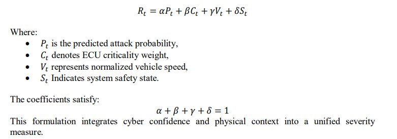 Since physical telemetry is not directly provided in the dataset, vehicle speed values were simulated within bounded ranges representing realistic operational conditions. ECU criticality weights were assigned according to subsystem safety importance, ensuring that safety-critical components contribute proportionally to the overall severity estimate. The computed risk score was incorporated into the reinforcement learning state representation to enable context-aware mitigation.