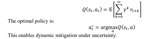 Adaptive mitigation is modeled as a Markov Decision Process (MDP), a formal framework widely used for sequential decision-making under uncertainty and constrained optimization [32]. The MDP formulation enables structured reasoning over state transitions, reward design, and policy optimization in safety-critical environments. The system is defined as: