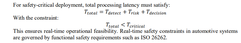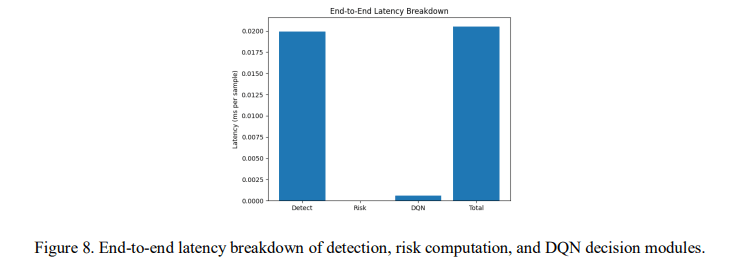 The real-time constraint formulated in Section 3.6 is validated through empirical latency measurement. Detection inference, risk computation, and DQN decision latency are measured independently and aggregated to verify compliance with safety-critical timing thresholds.