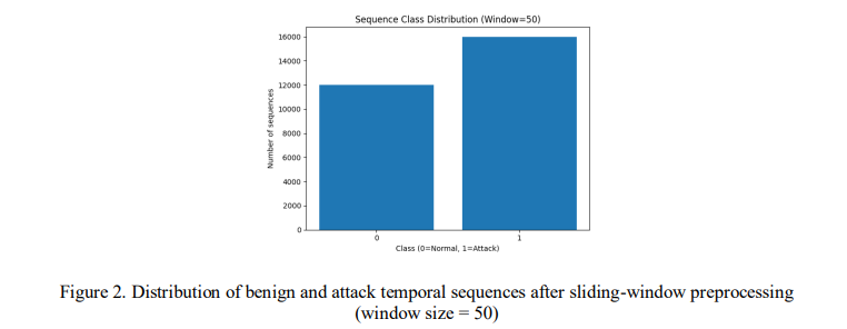 For controlled experimentation and reproducibility, 600,000 benign frames and 800,000 attack frames were sampled from the dataset. After window construction, the data were transformed into sequence-level samples. The resulting dataset was partitioned into training (70%), validation (15%), and testing (15%) sets using stratified splitting to preserve class distribution. Feature normalization was performed using min–max scaling to stabilize neural network training and ensure consistent gradient behaviour. The class distribution of temporal sequences after window construction is illustrated in Figure 2.