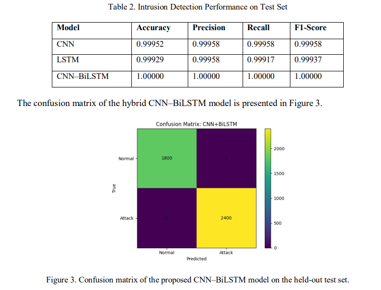 The CNN, LSTM, and hybrid CNN–BiLSTM models were evaluated on the held-out test set containing 4,200 temporal sequences (1,800 normal and 2,400 attack samples). Table 2 summarizes the classification performance.