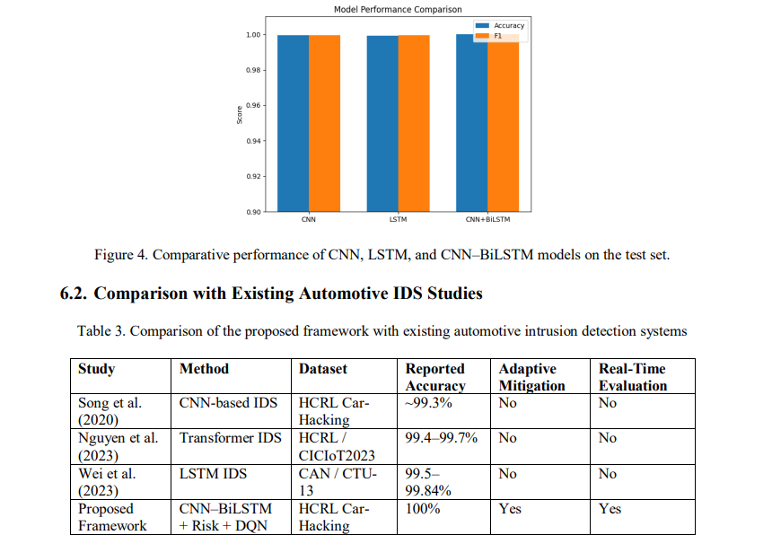 The proposed architecture is tested on the publicly available HCRL car hacking dataset, which includes normal, CAN traffic and various types of attacks such as DoS, fuzzy flooding, spoofing, and replay attacks [9]. Through experiments, it has been shown that the hybrid CNN-BiLSTM detection module provides high-quality classification results for balanced temporal windows with low inference latency. More importantly, the proposed architecture with the DRL-based mitigation layer reduces the system-level damage cost by more than 50% compared to a static monitoring system, which clearly indicates the benefits of adaptive response. End-to-end latency