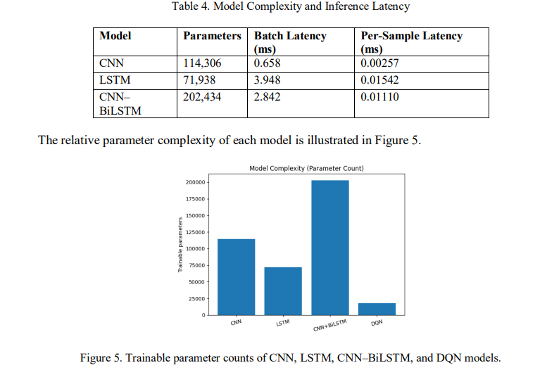 The hybrid CNN–BiLSTM architecture integrates spatial and sequential modeling within a unified framework. Model complexity was controlled to ensure deployment feasibility, and trainable parameter counts were recorded for comparative analysis. All models were trained using the Adam optimizer with a learning rate of 0.001 and binary cross-entropy loss. Training was performed for five epochs with a batch size of 256. Experiments were conducted on a Tesla T4 GPU using CUDA-enabled PyTorch.