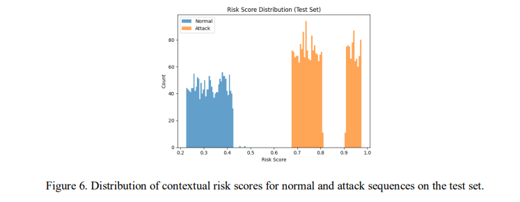 The distribution of risk values reveals a clear separation between benign and malicious temporal sequences. Normal traffic samples predominantly cluster within the lower-risk interval (approximately 0.25–0.40), whereas attack sequences occupy higher-risk regions (approximately 0.70–1.00). This separation suggests that the contextual formulation preserves detection confidence while incorporating additional physical-state information.