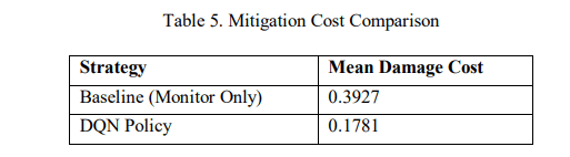 The learned DQN policy reduced the mean system damage cost from 0.3927 to 0.1781, corresponding to a relative reduction of 54.63% compared to the static baseline. This result indicates that adaptive response selection materially improves system-level safety outcomes beyond detection-only monitoring.