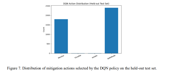 These findings reinforce that intrusion detection alone is insufficient for minimizing cyberphysical impact in autonomous vehicle systems. Integrating reinforcement learning-based mitigation enables context-aware intervention that reduces cumulative system damage while preserving operational continuity. The distribution of mitigation actions selected by the DQN policy is illustrated in Figure 7.