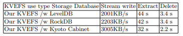 Three encrypt file systems for our experiment: KVEFS with Storage LevelDb, KVEFS with Storage RocksDb, and KVEFS with Kyoto Cabinet. The following criteria we use for testing: