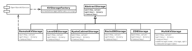 is option string to specific type of database is used. The developers only do on AbstractKV Storage to handle with key-value database. The version of OpenStars Storage used in this paper sup- port various types of key-value stores: leveldb , rockdb , kyoto cabinet, bigset[11], ZDB [10]. These key-value store can be used simultaneously by using MultiKV Storage. Key-value store can be served in a remote backend service. We can read and write data remotely by using RemoteKV Storage. These classes are shown in Figure 2.