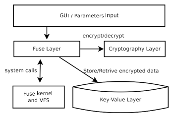 Figure 3 shows the architecture of KVEFS. We have divided our system into 4 layers: The GUI and Parameter Input Layer is the graphical user interface of the system to communicate with the user for ease of use and acquire parameters of key-value store and encryption op- tions; the FuseLayer is the main layer of the system to communicate with the kernel of the operating system to manipulate files and folders; the CryptographyLayer is for encryption and decryption data when read or write from a key-value stores; the Key − V alueLayer for storing encrypted information and data about file and folder structure. The details about these layer are presented below.
