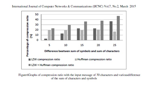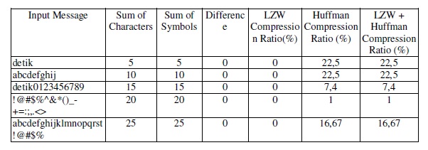The test above shows that the number of characters and symbol is equal that causes no repeatingcharacter pair defined that causes LZW compression ratio of 1:1. The scenario above shows thatit is only Huffman compressionthatworks,where the compression ratio will increase if the inputmessage character has a small bit representation in staticHuffman tree table. A non letter symbolhas a big bit representation so that the ratio is small.The following test is the test on the differenceof the input message of 30 characters that hasdifferent total number of symbols. The test can be seen in table 6 in appendix. Table 6 can besummarized into the graphs in Figure 6.