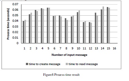Table 8 in the appendix is the result of process time used as to create and read messages involving20 samples. However, figure 8 shows the visualization in accordance with table8