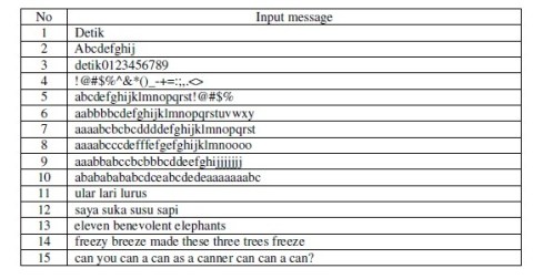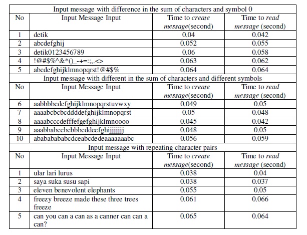 The process time used is almost same for all the tests conducted since all of the tests have asimilar process. However, the input message with more characters requires a longer time. Theprocess time cannot be separated from thehardware used in the experiment.