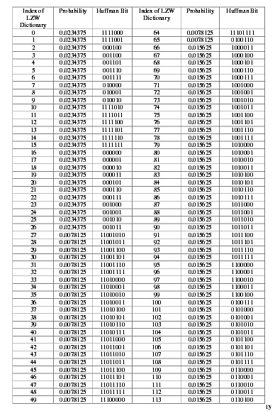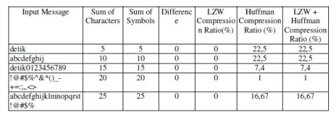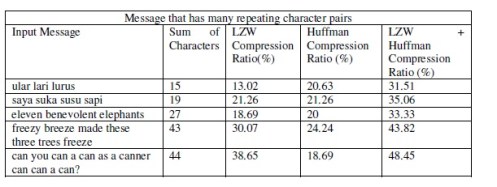 The following is the explanation on the compression result obtained from the manual calculation compared with the calculation using program. Meanwhile, the LZW compression process withthat input can be seen in table 4 in appendix.The dictionary index generated from LZW compression will be compressed by using Huffman compression with static tree table.