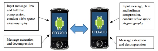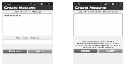 Privacy, especially in a cellphone, is an important thing and should be protected. Steganography is a method used to protect a sensitive information. The issue tried to be discussed in this study is the issue on inserting technique in a text through a simple method of White Space Steganography on android. The inserted message has been compressed through a double compression method by using LZW and Huffman so that the size of message to be inserted can be minimized while the capacity of the inserted message can be minimized. The compression shows that the compression ratio much depends on the type of text input to the text to be sent; the more the repetition or duplication found on the message, the smaller the compression ratio will be. The compression process using Android based smartphone is relatively fast with the average duration of 0.045 seconds, either for the insertion or extraction.