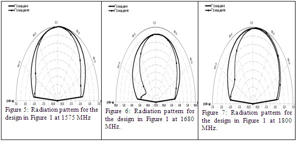 For the sake of justification, this design is simulated again using HFSS simulator as shown in Figure 3. It can be noted from Figure 4 that a very good agreement between both simulators is obtained Figure 3: Simulated reflection coefficient of our proposed design shown in Figure 1 [HFSS].Figure 4: Comparison between HFSS and IE3D results for the design shown in Figure 1. For the sake of justification, the radiation pattern of this design is studied at three different frequency values within the operating band. Specifically, Figures 5-7 show the radiation patterns at 1575 MHz, 1680 MHz, and 1800 MHz. It can be noted that the pattern is almost the same at the three frequencies. In these figures, the beam in the =90o plane gets a bit tilted from broadside as the frequency increases.