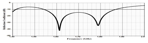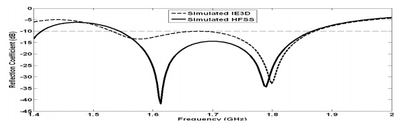 Figure 10 shows the simulated reflection coefficient using HFSS. The obtained results, using both simulators, are close to each other as shown in Figure 11