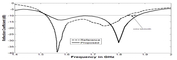 Figure 20 shows a comparison between result obtained from reference [13] and result obtained from proposed design in figure 1. As shown in the figure more bandwidth can be obtained in the proposed design. It can be seen that the proposed design has a bandwidth of 340 MHz, and a center frequency of 1700 MHz, which implies that a fractional bandwidth of 20% can be obtained, whereas the obtained bandwidth in [13] is 308 MHz and a center frequency of 1677 MHz, which implies that a fractional bandwidth of 18.3%. It can be noted, first proposed design is better than the design proposed in [13] in terms of bandwidth and fractional bandwidth.