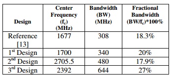 Table 1 shows a center frequency, bandwidth and fractional bandwidth for all designs which summarize all the results mentioned above.