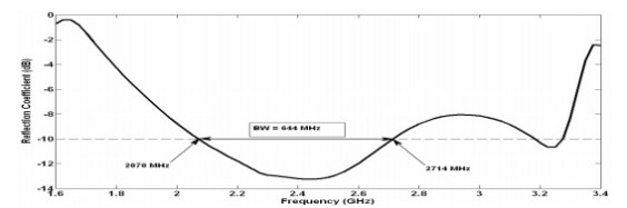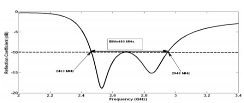 From Figure 9, it can be seen that this patch operates at frequencies ranging from 2463 MHz to 2948 MHz, with bandwidth equal to 485 MHz. Again, this design is simulated using HFSS simulator for the sake of justification.