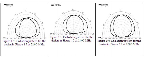 The radiation pattern of this design is studied at three different frequencies. From Figures 17-19,it can be noted that the pattern is almost the same at the three frequencies. The radiation is in the broadside direction in the Φ=0o plane, while it is titled approximately 45o in the Φ=90o plane