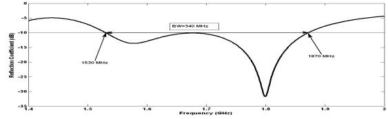 It was demonstrated that, loading the patch with a U-shaped slot will enhance the bandwidth [13]. Figure 1 shows a proposed ETPA, loaded with slots. In this design, two techniques are exploited to obtain broadband operation. In the first technique the patch on thick substrate is mounted with loaded slot. In the second technique the patch is loaded with a notch which enhances the bandwidth. By combining both techniques, a broadband antenna that operates in frequencies ranging from 1530 MHz to 1870 MHz is obtained as shown in Figure 2. It can be seen from Figure 2 that the proposed design has a bandwidth of 340 MHz, and a center frequency of 1700 MHz, which implies that a fractional bandwidth of 20% can be obtained. Moreover, it can be noted that this design can fit wireless communication application.
